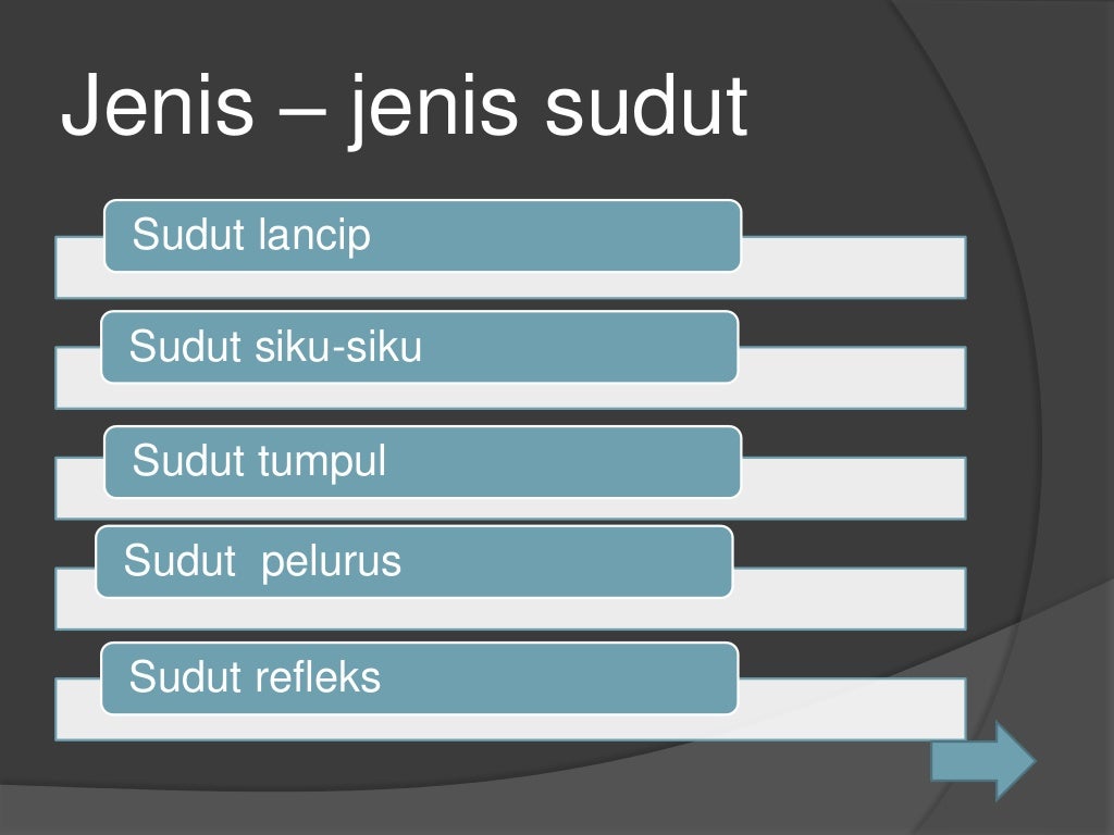 Sudut tumpul = obtuse angle 3. Sudut refleks adalah sudut yang memiliki besar diantara 180º dan 360º, 180º < α < 360º. Hubungan antar sudutyaitu sudut yang bertolak belakang, sepihak. Berdasarkan nilainya, sudut terbagi menjadi 6 macam. Menurut notasi ilmu matematika, sudut ini ditulis.